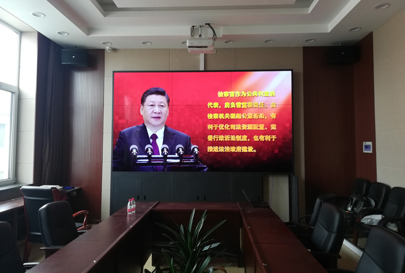 該案例中,維康國際為遼寧沈陽某檢察院提供一套會(huì)議大屏,采用3行3列,機(jī)柜式安裝安裝的55寸液晶拼接屏,超窄邊設(shè)計(jì),雙邊物理拼縫僅有0.88mm,有著很好的大屏畫面一體化顯示效果。