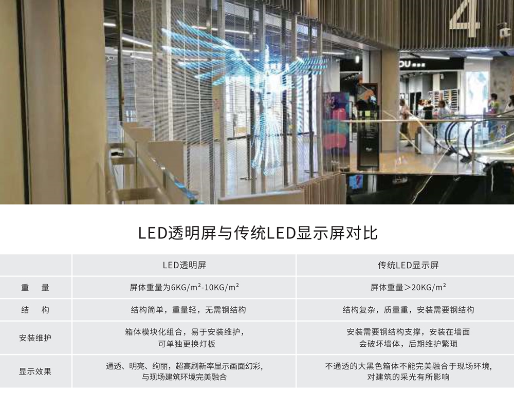 LED透明屏采用鏤空條狀設計,相對與傳統(tǒng)LED顯示屏箱體,其結構更加靈活,重星更輕。