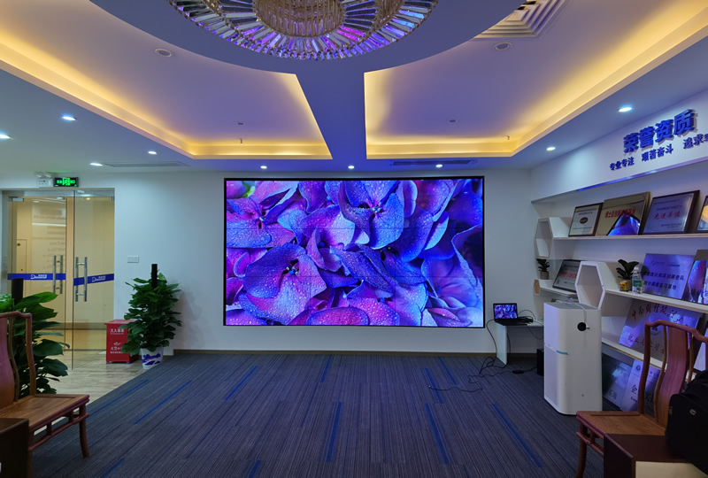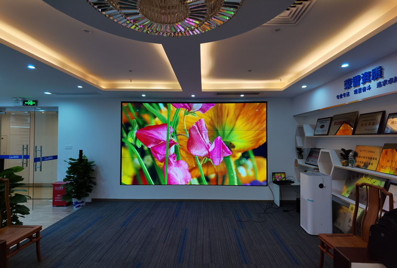本案例中,維康國際為深圳羅湖某科技公司的展廳提供一套顯示大屏,采用3行3列拼接、55寸LG液晶拼接屏,超窄邊設(shè)計,大屏顯示清晰亮麗,物理拼縫僅有0.88mm,有著很好的畫面一體化顯示效果。