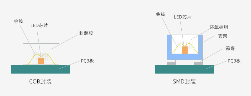 COB技術(shù),是將發(fā)光二級(jí)管芯片通過(guò)固晶超聲波焊接方式,用硅樹(shù)脂將晶元、引線直接封閉在電路板上,然后將LED直接安放在基底表面,熱處理至LED牢固地固定在基底為止,隨后再用絲焊的方法在LED和基底之間直接建立電氣連接,省去了SMD的燈珠封裝、貼片、回流焊等工藝,提升了器件的集成度和穩(wěn)定性。