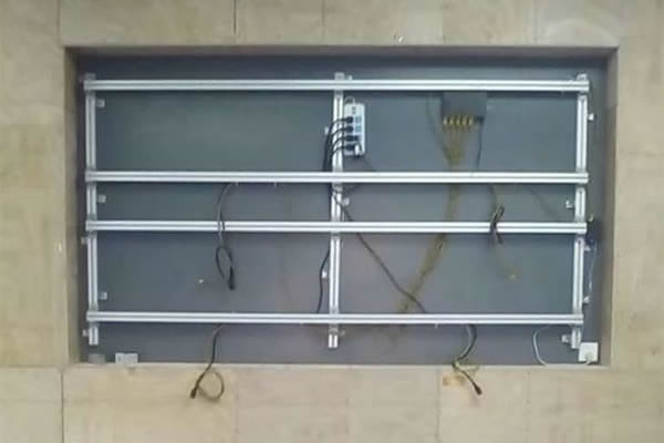 嵌入式安裝就是在墻體上預(yù)留凹形空間,然后安裝支架,在安裝屏幕后再對屏幕進(jìn)行包邊處理,優(yōu)點(diǎn)是可以跟周圍的環(huán)境更好的融合,能夠更加節(jié)省空間,同時美觀性也比較好,考慮到維護(hù)問題,一般在屏體數(shù)量不多的情況下采用,這還需要在裝修時預(yù)留位置后期才好安裝。