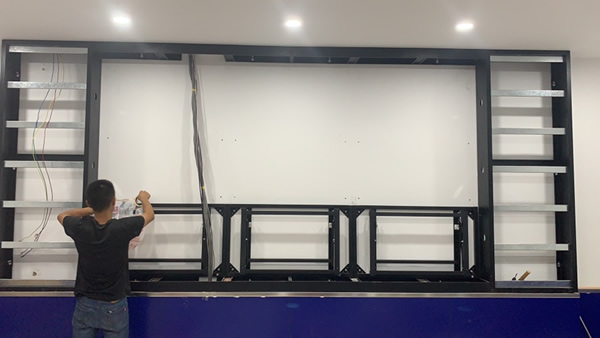 后維護(hù)方式指的是在拼接屏的后側(cè)進(jìn)行維護(hù),需要在屏幕背面留出足夠的維修通道,正常情況下約預(yù)留60公分以上的寬度,對施工空間的要求較高,而且會在一定程度上壓縮可視空間,這一般適用在空間較大的安裝環(huán)境。
