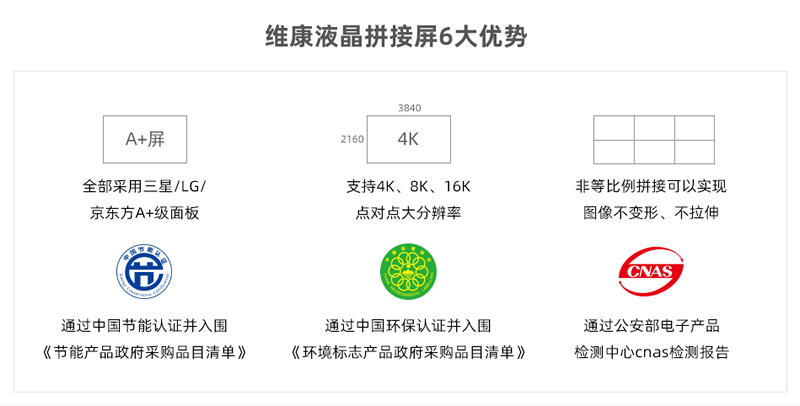 維康國際通過了ISO9001質量管理體系、ISO14001、OHSAS18001、3C、節(jié)能認證、環(huán)保認證、公安部cnas檢測報告、抗震8級、防塵、CE、CB、FCC、ROHS、外觀專利、大屏軟件專利等,在支持客戶參與招投標項目中有很大優(yōu)勢。
