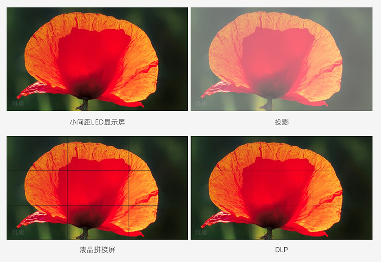 以下為小間距l(xiāng)ed顯示屏、投影、液晶拼接屏、DLP四種主流的大屏顯示技術(shù)的效果對(duì)比,通過(guò)對(duì)比可以看到投影由于對(duì)比度低導(dǎo)致屏幕發(fā)白,而液晶拼接屏與DLP都有不同程度的拼縫,P1.2小間距l(xiāng)ed顯示屏由于點(diǎn)間距只有1.2毫米,所以即沒(méi)有拼縫而且分辨率也有保證。